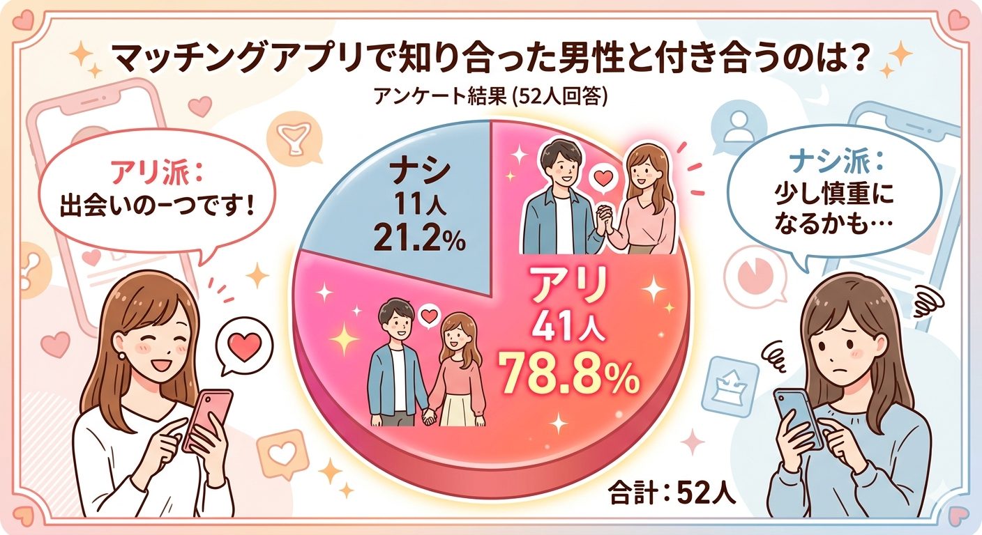 マッチングアプリで知り合った男性と交際はアリ!と答えてくれた41人の女性の意見を紹介したいと思います。