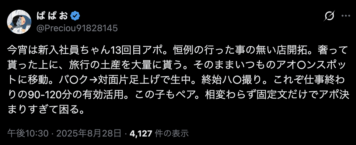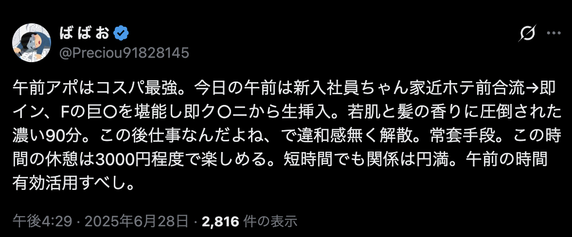 - 即(直接ホテル、直接自宅、飲み→ホテル・自宅など)