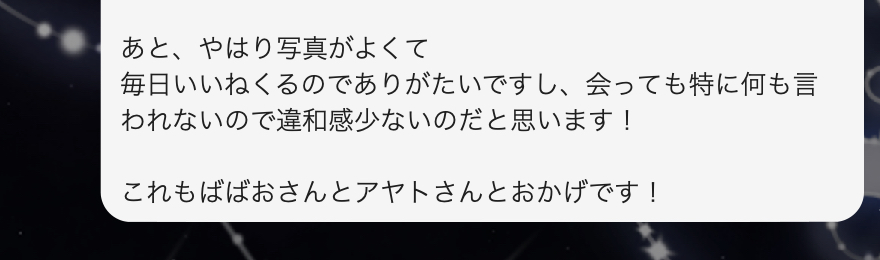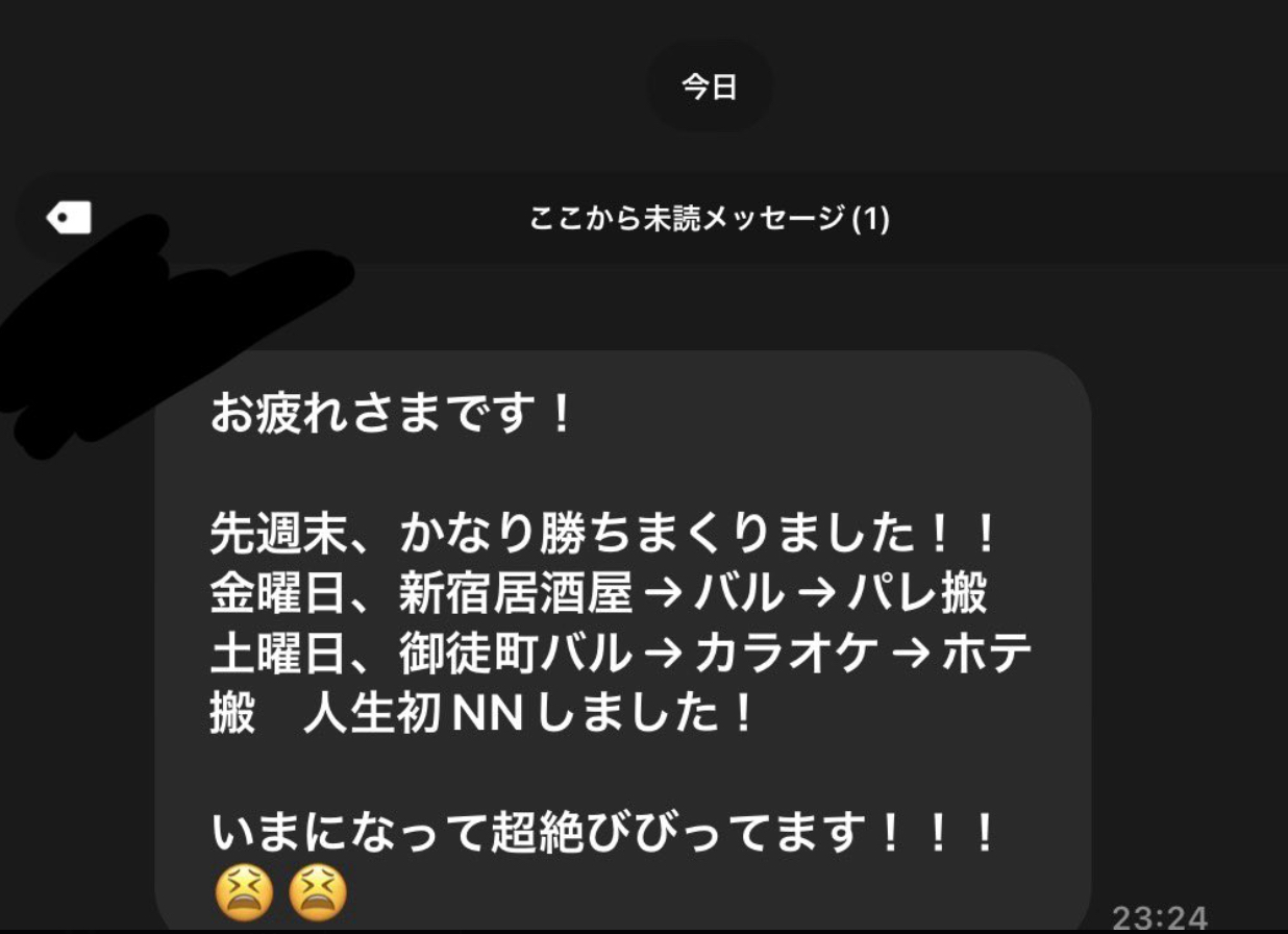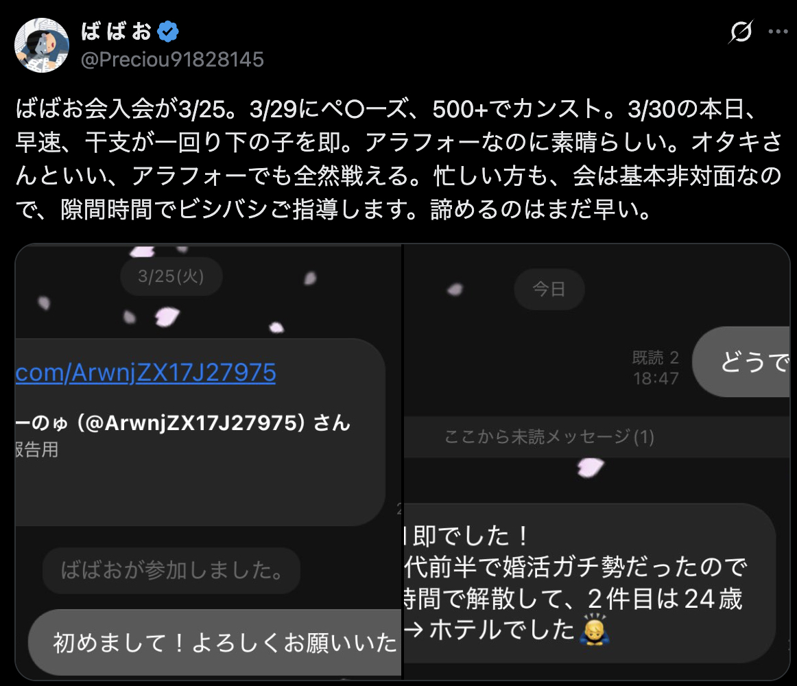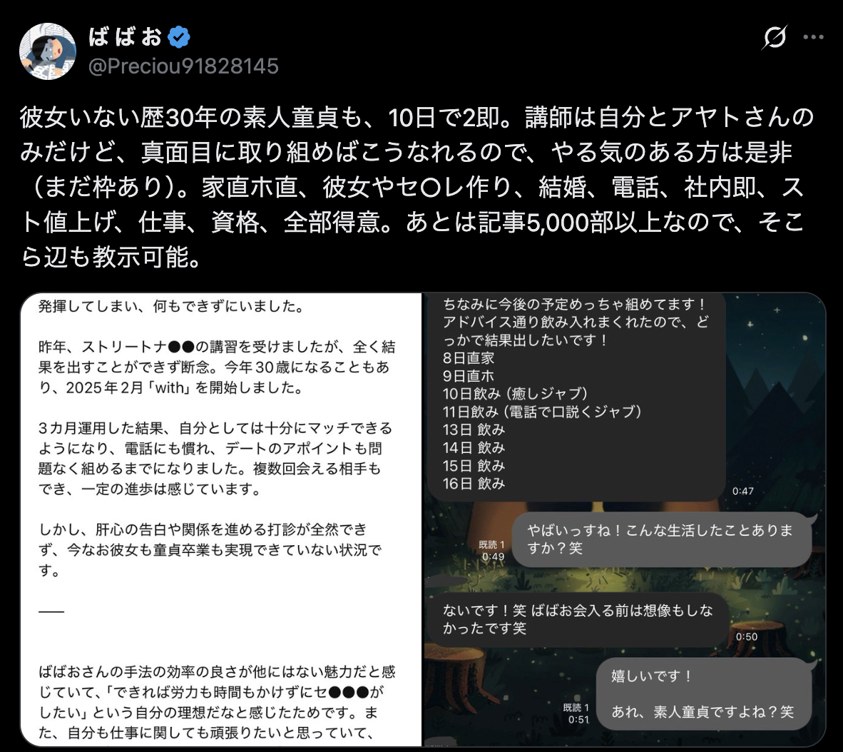 ばばおさんがTwitter(X)投稿したメッセージスクショの全文を見せてもらうなんてのもアリですよ。(身バレ防止のため、Twitterでは一部しか投稿していないため)