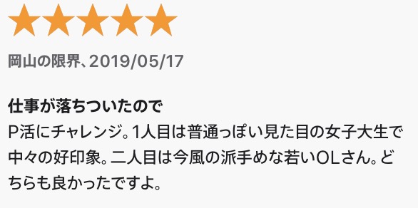 仕事が落ち着いたのでP活にチャレンジ。1人目は普通っぽい見た目の女子大生でなかなかの好印象。二人目は今風の派手めな若いOLさん。どちらもよかったですよ。