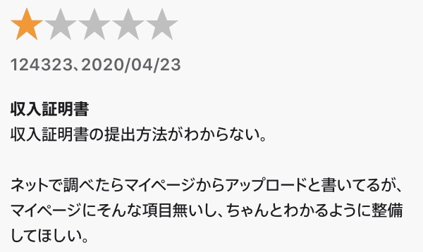 収入証明書の提出方法がわからない。ネットで調べたらマイページからアップロードと書いているが、マイページにそんな項目無いし、ちゃんとわかるように整備してほしい。