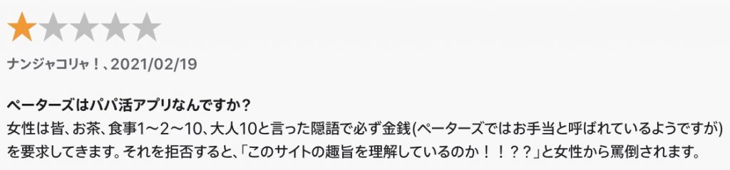 ペイターズはパパ活アプリなんですか?女性は皆、お茶、食事1~2~10、大人10といった隠語で必ず金銭(ペイターズではお手当と呼ばれているようですが)を要求してきます。それを拒否すると、「このサイトの趣旨を理解しているのか?」と女性から罵倒されます。